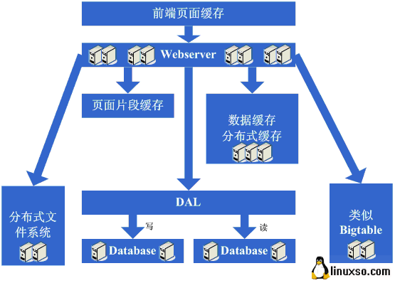 突然有一天,发现这个完美的时代也要结束了,数据库的噩梦又一次出现在眼前了。由于添加的webserver太多了,导致数据库连接的资源还是不够用,而这个时候又已经分库分表了,开始分析数据库的压力状况,可能会发现数据库的读写比很高,这个时候通常会想到数据读写分离的方案。当然,这个方案要实现并不容易,另外,可能会发现一些数据存储在数据库上有些浪费,或者说过于占用数据库资源,因此在这个阶段可能会形成的架构演变是实现数据读写分离,同时编写一些更为廉价的存储方案,例如BigTable这种。