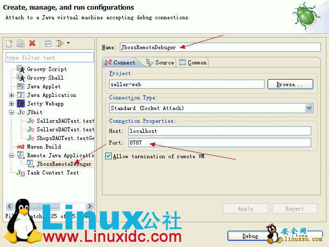Run-->Debug Configrations-->Remote Java Application 然后双击该菜单Remote Java Application,在弹出的界面做如下配置: