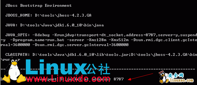 2. 打开Jboss安装目录下的bin目录,找到run.bat文件(Windowx环境,Linux请看文章最后),搜索8787,找到如下一行: