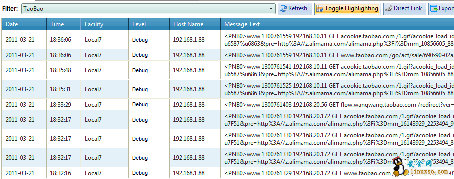 我们使用过滤器对时间进行过滤,就可以发现那些用户在访问淘宝这些网站了: