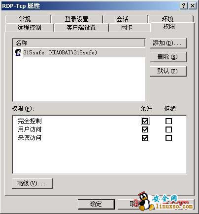 在“管理工具”---“终端服务配置”---“连接”,再选择右边的“RDP-TCP”的属性,找到“权限”选项,删除administrators组,然后再添加我们允许的315safe这个用户,其他一律不允许登陆。