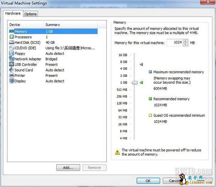 3、目前我们的系统只有一块40G的虚拟硬盘。我们点击add 添加硬件。