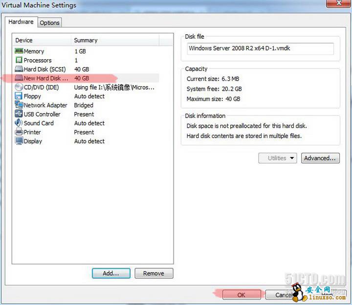 在前几次的Server2008实验里面,我们向服务器FS01、FS02分别添加了一个磁盘分区E盘。但是没有介绍我们是如何通过VMWare Workstation来实现的。今天就让我们来一起利用VMWare Workstation来向虚拟主机添加一块新的硬盘并启用。利用虚拟机做实验,添加硬件,确实方便了很多。