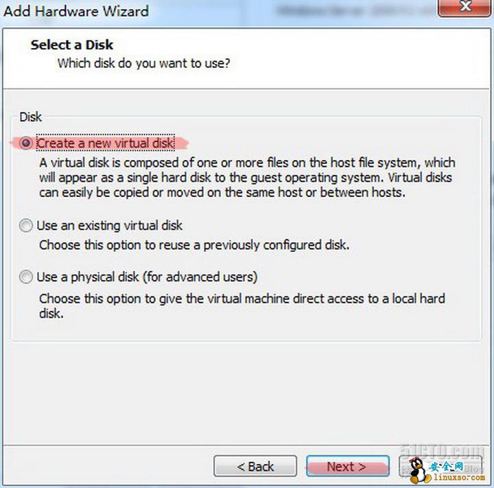 5、我们选择新建一块虚拟次磁盘,然后下一步。